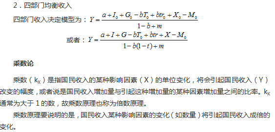 乘数是指自发总需求(包括消费、投资和政府支出)的增加所引起的国民收入增加的倍数,或者说是国民收入增加量与引起这种增加量的自发总需求增加量之间的比率。乘数理论回答总需求增加与国民收入增加量之间的关系。
