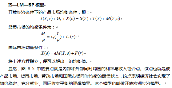 模型就是从上述三个等式出发展开对不同汇率制度下经济稳定政策的讨论的。经济均衡要求三个市场——商品市场、货币市场和国际收支——同时达到均衡。当、