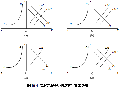 浮动汇率制度下,如果实施货币扩张(如图10-4(d)所示)。曲线右移,利率下降,本币贬值导致本国商品的国际竞争力上升,出口上升,进口下降,总支出增加,
