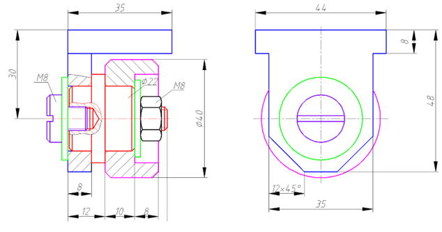 图1.1所示为滑轮装配草图,图1.2是其中用于支撑滑轮轴的支架的零件图,。要求:在老师带领下读懂支架零件图中各符号的含义,并用A4图幅,按照国家标准规定的线型画法及尺寸标注的规则,按1:1的比例抄画该零件图。