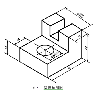 根据图2所示垫块轴测图绘制其三视图,并标注尺寸。另注:图中立板的长方槽宽10mm,深10mm,开在竖板中间,零件材料为45钢正火,要求硬度169-217HBS。要求:选用合适的图幅和比例,按制图规范绘制。