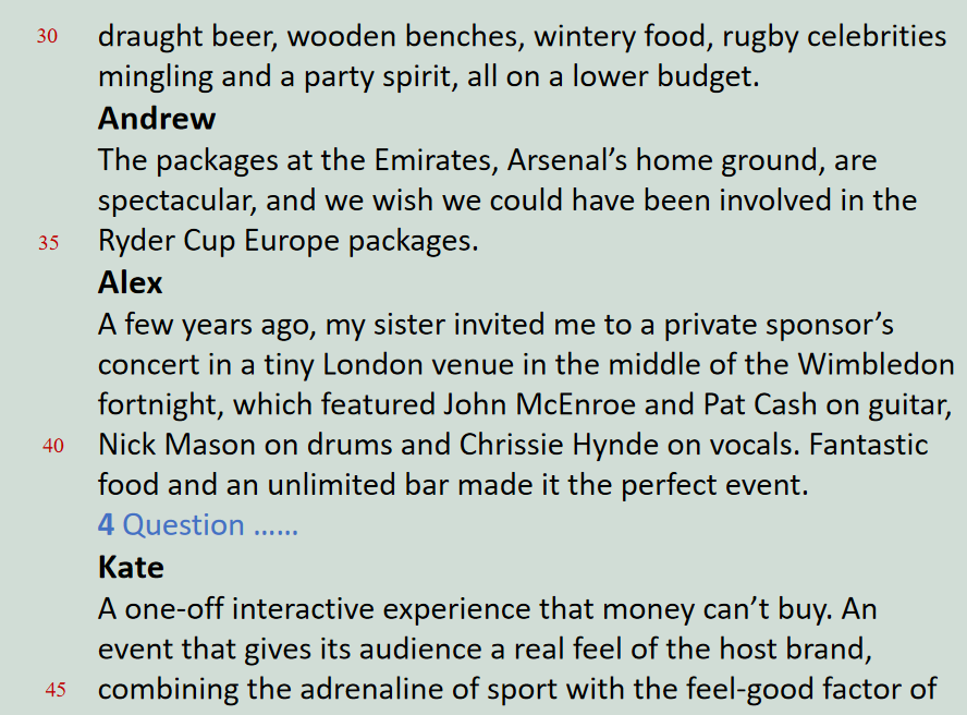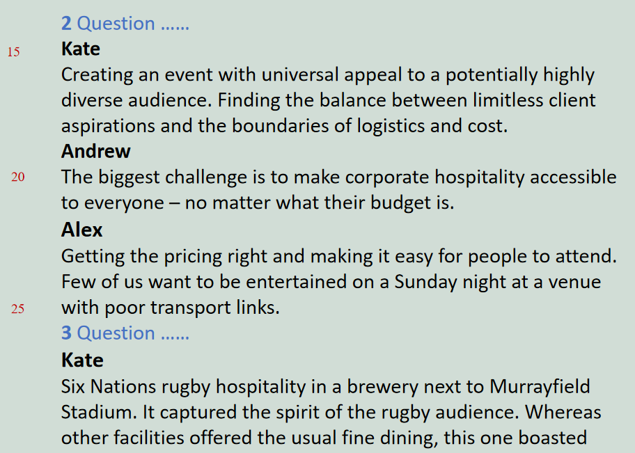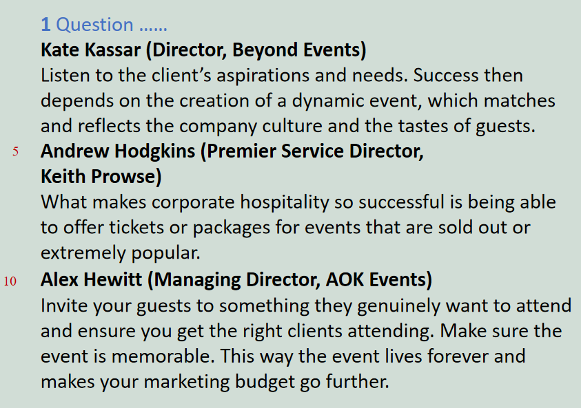 The corporate-hospitality club asked three entertainment experts some questions. Put four of these questions in the appropriate places.