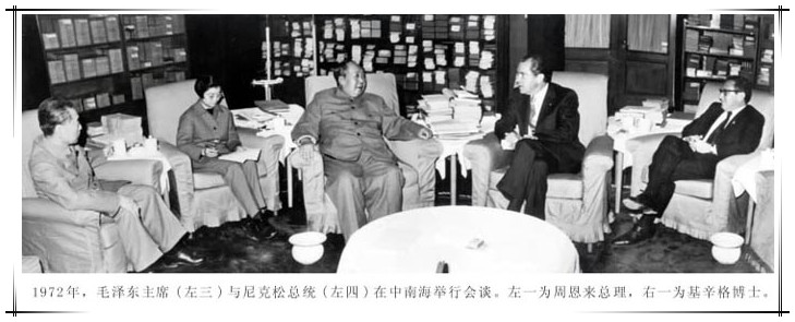 1972年2月21日—28日,尼克松访问中国。毛泽东会见了尼克松,周恩来总理与尼克松总统就两国关系正常化等问题进行了会谈。之后,中美双方于2月28日发表了著名的《上海公报》,全称为《中华人民共和国和美利坚合众国联合公报》。公报强调:中美双方任何一方都不应该在亚洲太平洋地区谋取霸权;美国声明只有一个中国,台湾是中国的一部分;两国将根据和平共处五项原则处理相互之间的关系。尼克松还高度评价他的这次中国之行,称其为是“改变世界的一周”,