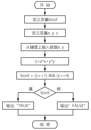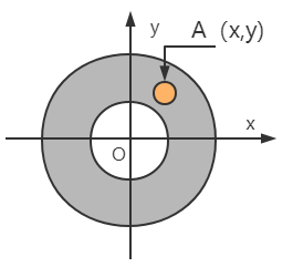 例3-10 由半径为 1 的圆和半径为 2 的圆所围成的圆环如图3-19 所示。编写程序,输入点A的坐标x、y,若点A(x,y)在圆环内,则输出 TRUE,否则输出 FALSE。