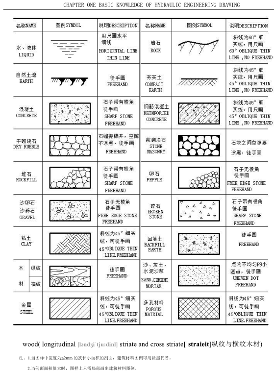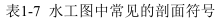图样中的剖面符号应按国标《技术制图》和行业标准《水利水电工程制图标准》的规定绘制。水工图中常用的剖面符号见表 1-7。