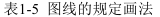 同一张图纸上同类图线的宽度应基本一致;虚线、点画线的线段长度和间隔应大致相等。图线的宽度靠削磨铅笔芯来控制,线段的长短和间隔靠目测控制,图线的浓淡靠手画图时的力度控制。图线的规定画法见表 1-5。