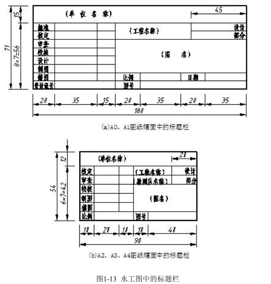 图 1-13 所示,是《水利水电工程制图标准》中推荐的水工图样标题栏的格式和尺寸。