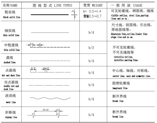 图线是组成图形的基本要素。为了使图样中表达的内容主次分明,图线有粗线、中粗线和细线之分,三者的的宽度比率为 4:2:1。所有线型的图线宽度应按图样的类型和尺寸大小在下列数系中选择:0.13、 0.18 0.25、 0.35、 0.5、 0.7、 1、 1.4、2.0mm。技术制图标准中用 d 表示所有线型的图线宽度。粗实线的图线宽度习惯上用字母 b 表示,并根据图样的比例和复杂程度一般在 0.5~1.4mm 之间选用,常用的 b 值为 0.5~0.7mm。