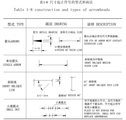 (3)尺寸起止符号。尺寸起止符号表示尺寸的起止点。尺寸起止符号的形式和有关规定见表 1-8。在圆上标注半径、直径与标注角度、弧长的尺寸起止符号一律采用箭头,同一张图样中线性尺寸的起止符号只能在箭头和斜短线之间选用一种形式。
