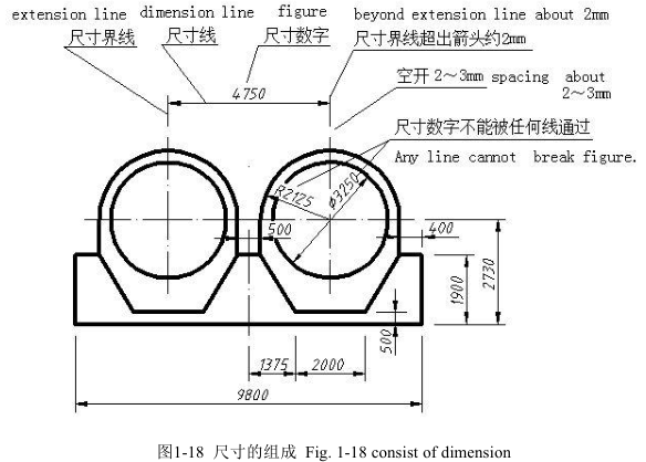 一个完整的尺寸由尺寸界线、尺寸线、尺寸起止符号、尺寸数字四部分组成,如图 1-18 所示。
