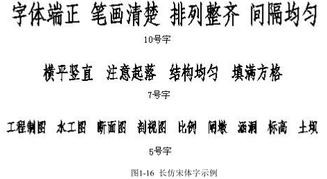 汉字应写成长仿宋体字,并应采用国家正式公布的简化字。汉字字高不应小于3.5mm,字宽一般为 h/ 。长仿宋体字的示例如图 1-16 所示。