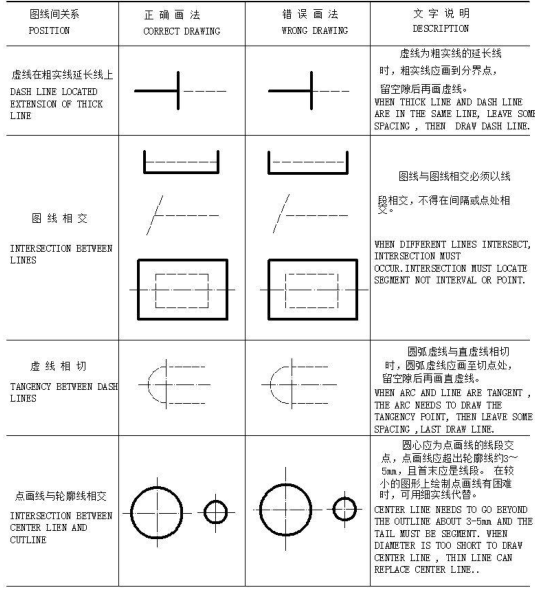 The width of the same drawing should be consistent. For example, the length of segment of dash line, center line should be approximately equal. So do the intervals. Sharpening cone can control the width of line; however, segment and interval can do through visual inspection. Drawing strength determines the light or dark of lines Graph representations are shown in table 1-5.