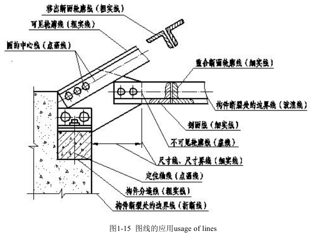 各种图线的应用举例如图 1-15 所示。 Application of lines is shown in fig 1-15.