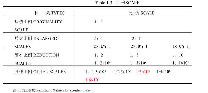 图样中图形与其实物相应要素的线性尺寸之比称为比例。国标《技术制图比例》(GB/T 14690-93)对图样中的比例大小和注写方式都作了规定。绘制图样时,应根据物体的大小及其形状的复杂程度,由表 1-3 规定的系列中选取适当的比例。比例= 图形:实物。