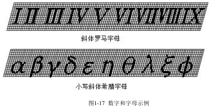 数字和字母可以写成斜体或直体。斜体字字头向右倾斜,与水平基准线成 75°。图样中常采用斜体字,如图 1-17 所示。