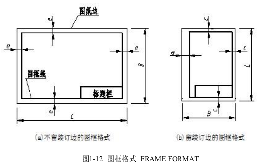 绘制图样时,必须在图纸上用粗实线画出图框,图形只能绘制在图框内。图框格式分为不留装订边和留有装订边两种,但同一产品的图样只能采用一种格式。