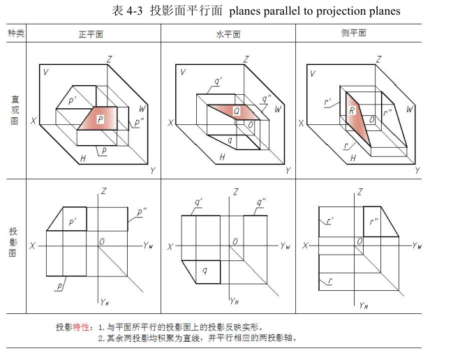 各种投影面平行面的直观图、三投影图及投影特性见表 4-3。