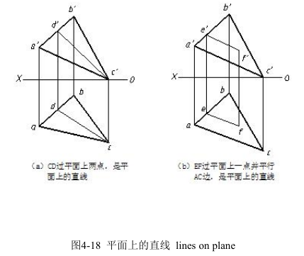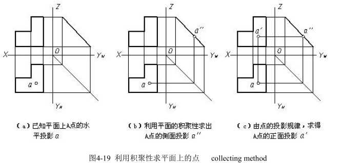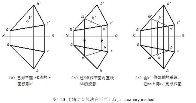 If a point is located in any line of plane, it is sure the projection of point must be on the plane.Assume a point is on the special position plane, one can apply to collecting feature to work out the projection of point and the construction steps are as follows in 4-19. However , if a point on a general plane, the solution is to draw an auxiliary[ɔ:gˈzɪliəri]line through the point and make sure the line is on the plane , and then figure out the projection of the aided line ,finally get the projections of point. The method is of using auxiliary line on plane and steps are as shown in fig4-20.