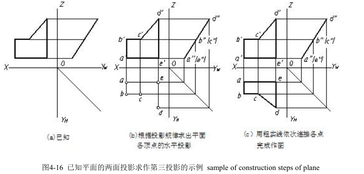 As we all know, any surface is surrounded by line segments, meanwhile, any line segment is made up of points. Thus, one can draw the projection of each point of the surface, and then connect the projections of the points in the same projection plane and as shown in fig 4-16.