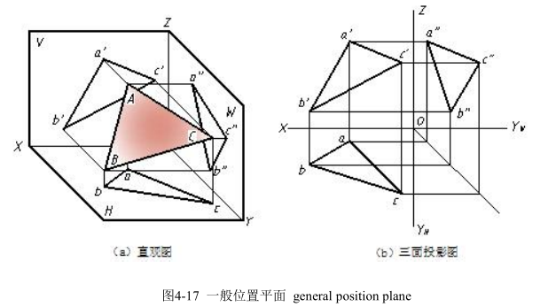 相对三投影面都倾斜的平面称为一般位置平面,如图 4-17 所示。平面对 H、V、W三投影面的倾角分别用α、β、γ表示。