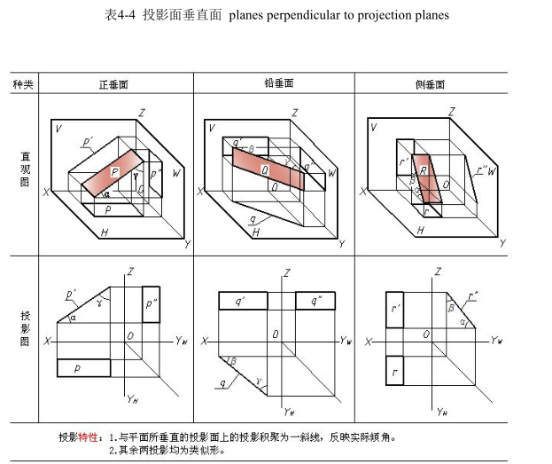 各种投影面垂直面的直观图、投影图及投影特性见表 4-4。