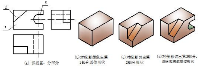 ① 识视图、分部分。先识视图后分部分,看三个视图中的小线框都套在大线框内,可以判定该物体是由基本体切割形成,分部分时,应先把原体分为一部分,然后再分切割处。各视图中大线框就是原体的投影,分为第“1”部分,另有两处切割,共分三部分,如图 6-4 (a)所示。