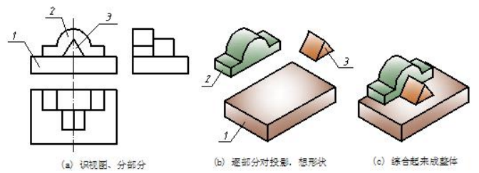 Find out projection of each part and imagine basic solids. The front view of part is a rectangle and the other two views are both rectangles based on projection rules.According to projection characteristics of basic solid, the basic solid of part 1 is a box. the solid of part 2 is a composite column because its front view is a composite frame and the other two views are both rectangles; the solid of part 3 is a triangular prism in the same way.