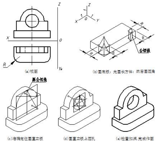 该物体是一个既有叠加又有切割的综合体,由底板和直立板两部分叠加,底板上有两个圆角,直立板上挖了一个圆通孔,画该物体的正等测应综合运用上述方法。作图步骤如图7-13(b)、(c)、(d)、(e)所示。