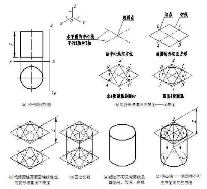 The method is to draft the isometric drawing of two bases, and then add the connecting straight lines on the outside of the profile (轮廓,外形).When the circular base plane is parallel to coordinate plane, the isometric drawing has the shape of an ellipse. An approximate method is commonly introduced to draw isometric circles in each of the three major planes. In this way, an approximate ellipse can be easily developed with drawing compasses. The precision is adequate for pictorial drawing. Take a horizontal circle as an example to explain the construction steps.