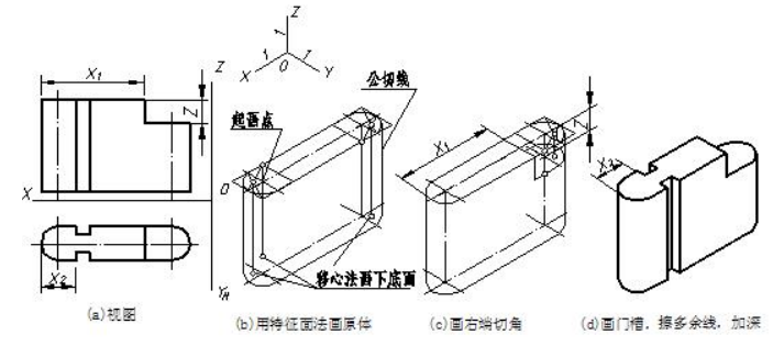 闸墩是一个切割体,原体是上下底面为水平面的组合柱,右端切角,左端前后各切出一个长方体形门槽。用切割法画闸墩正等测,起画点宜选在组合柱上底面圆的圆心处。作图步骤如图 7-12(b)、(c)、(d)所示。