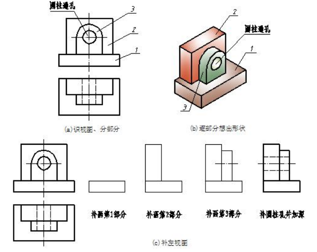 (2)根据两面视图补画第三视图。该练习简称“补视图”或“二补三”,这是一种最常用的练习读图的方