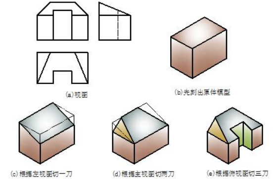 (1)刻模型。刻模型的方法适用于初学者,其要点是:利用已知视图的外轮廓先想出大致表示一个什么基本形体,而后利用每个视图的观看方向,边看图边刻模型,直至模型与视图完全对应。