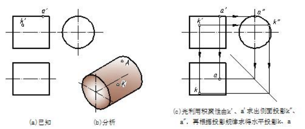 圆柱面的侧面投影积聚为一圆线,因此 K、A 两点的侧面投影 k″、a″必在该圆周上,可直接求。由于 k′、a′可见,所以 K 点位于圆柱的前半圆柱面上,A 点位于正向轮廓素线上,如图 4-10(b)所示。