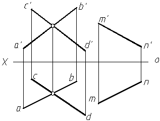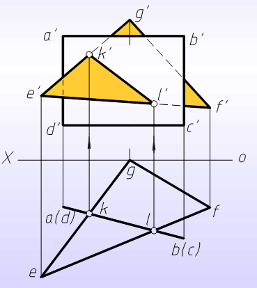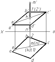 两平面正面投影的重叠部分,交线左方三角形平面在前,故e¢k¢l¢见,a¢b¢被遮挡的一段应画成虚线;交线右方的四边形平面可见,三角形平面轮廓线被遮掩部分应画成虚线。为使图形明显起见,可在一个平面的投影的可见部分画上45°线。