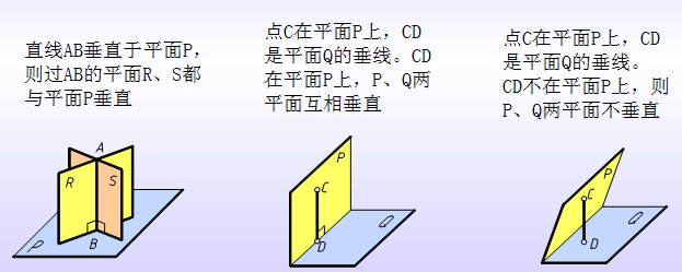 由初等几何可知,如一直线垂直于某平面,则包含此直线的一切平面都与该平面垂直。反之,如两平面互相垂直,则由一平面上任一点向另一平面所作的垂线,必在前一平面上。