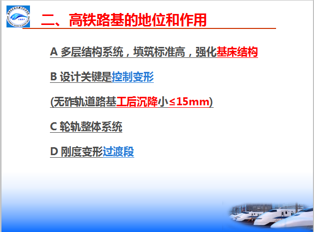 高速铁路路基应按土工结构物进行设计,其地基处理、路堤填筑、边坡支挡防护以及排水设计等必须具有足够的强度、稳定性和耐久性,使之能抵抗各种自然因素作用的影响,确保列车高速、安全和平稳运行。