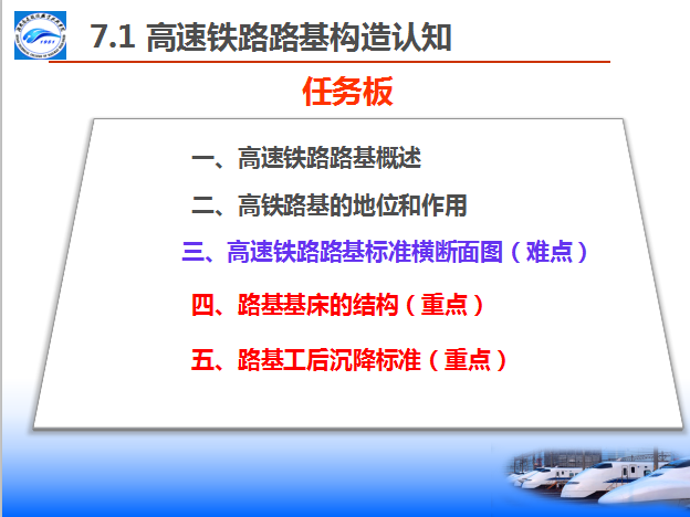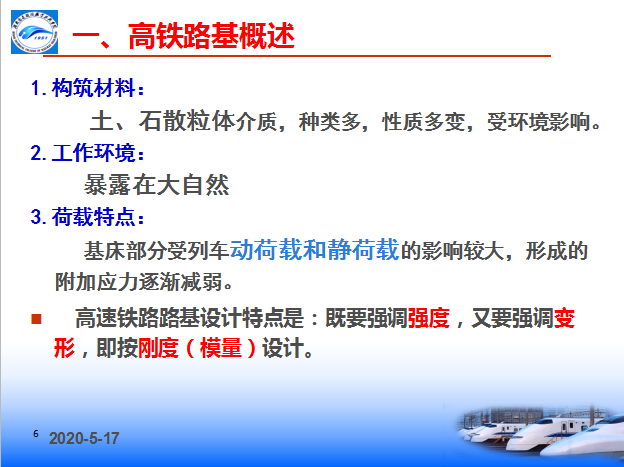 高速铁路路基是轨道的基础,路基的强度、刚度、长久稳定是保证高速铁路列车能高速、舒适、安全运送旅客的基本条件。有必要认知路基在高速铁路中的地位和作用,高速铁路路基工程的技术特点,以及高速铁路路基的发展情况等。