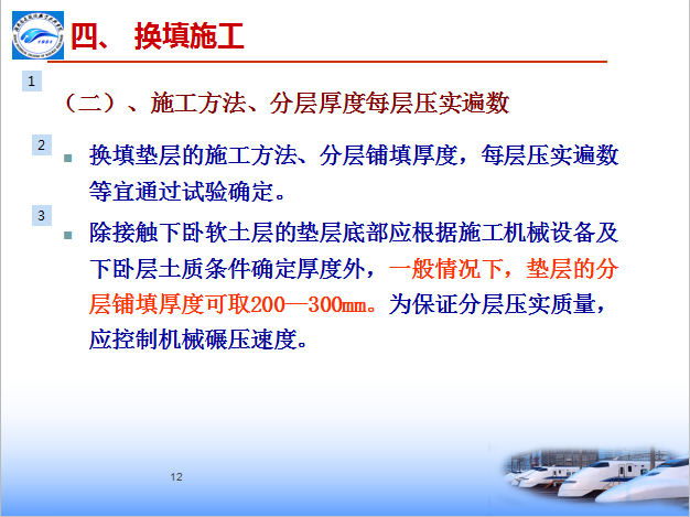除接触下卧软土层的垫层底部应根据施工机械设备及下卧层土质条件确定厚度外,一般情况下,垫层的分层铺填厚度可取200—300mm。为保证分层压实质量,应控制机械碾压速度。