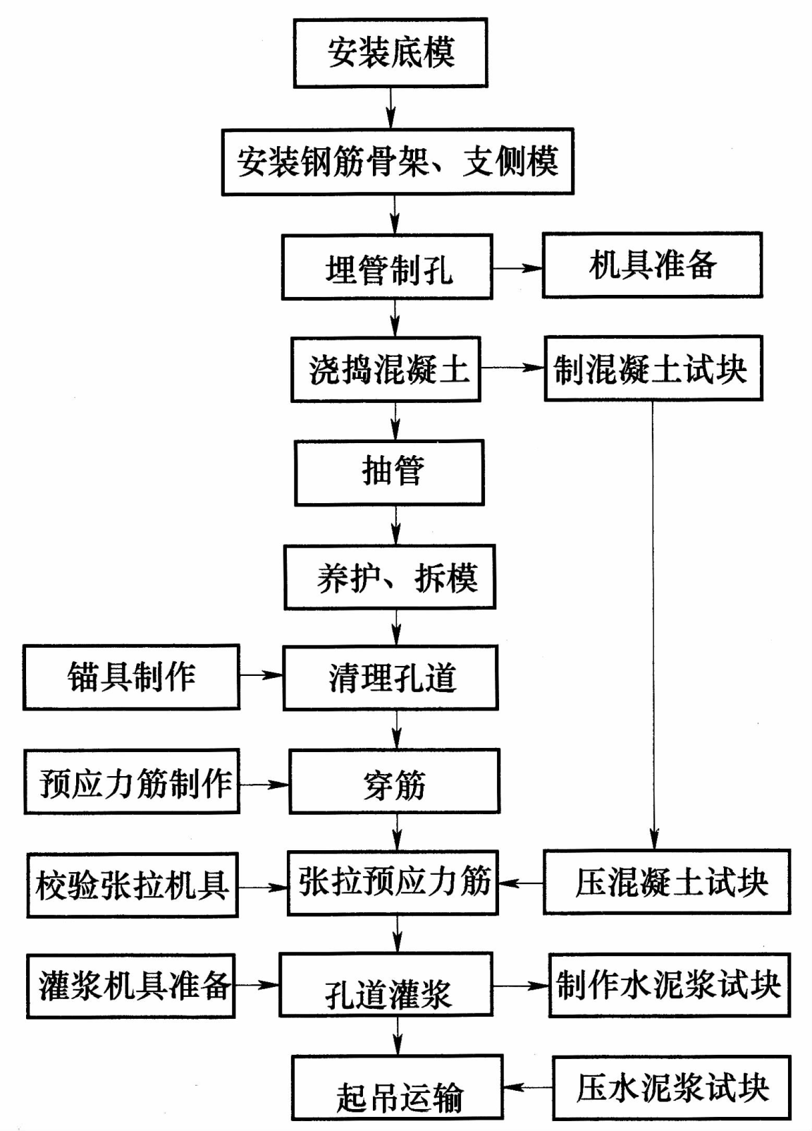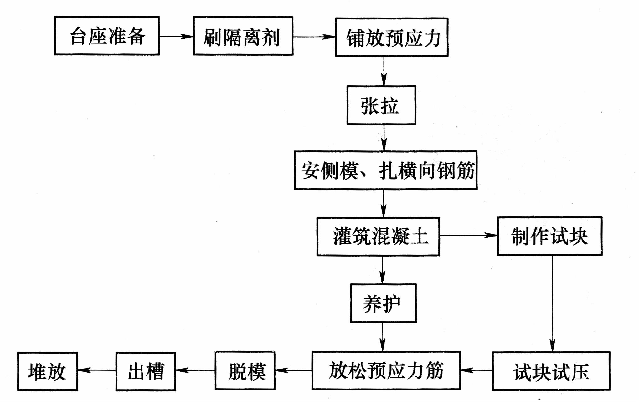 1. 先张法施工工艺流程:台座准备→铺放预应力筋→张拉→安侧模绑扎横向筋→浇筑混凝土及养护→放松预应力筋;