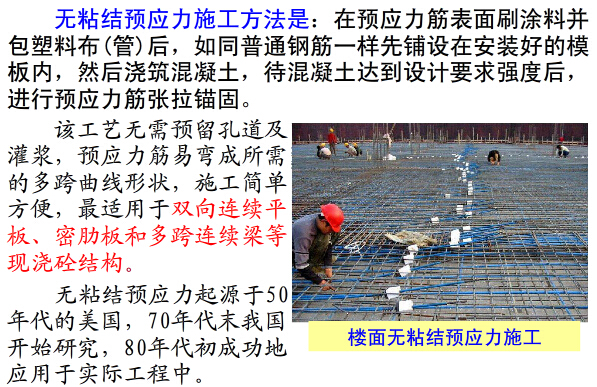 先制作留有孔道的混凝土构件,混凝土达到设计规定强度后,穿筋,借助锚具把预应力筋锚固在构件端部,并用张拉机具张拉钢筋至设计规定应力值,最后孔道灌浆,张拉力由锚具传给混凝土构件,并使之产生预应力。