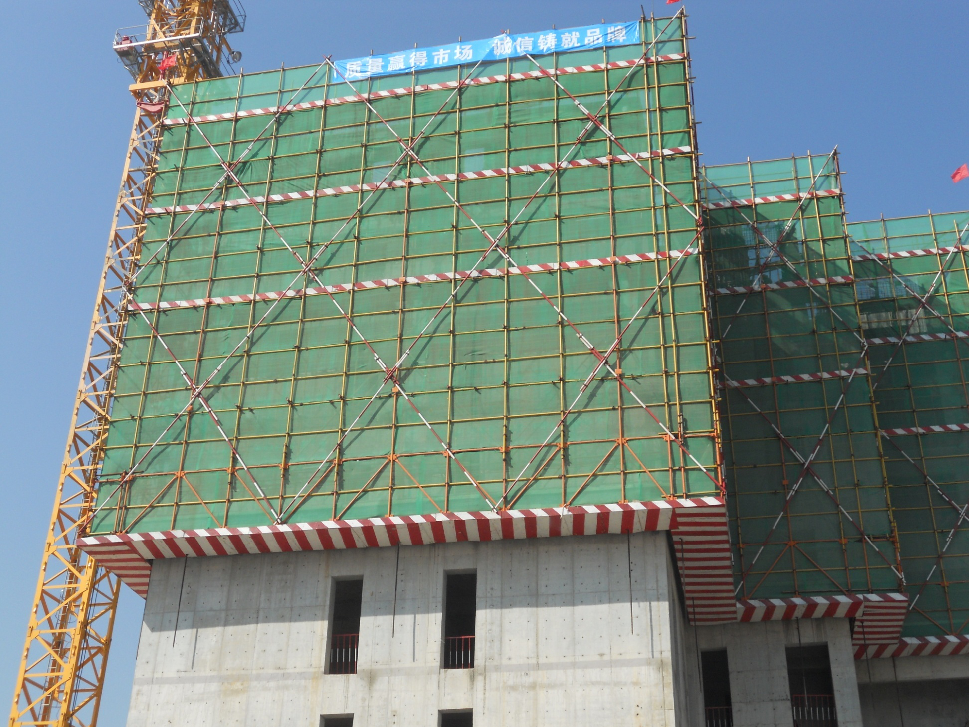 外挂脚手架:随主体结构逐层向上施工,用塔吊吊升,悬挂在结构上。