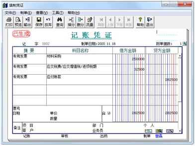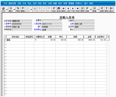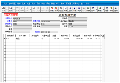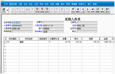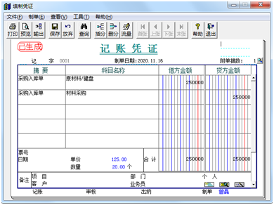 (1)2020年11月16号,向亚捷公司订购的20个键盘到货,入材料二库。收到采购专用发票一张,票号为1916,无税单价125元。