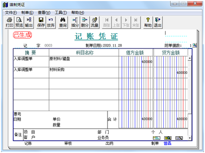 (2)2020年11月28日,将11月16号发生的采购键盘的入库成本增加400元。