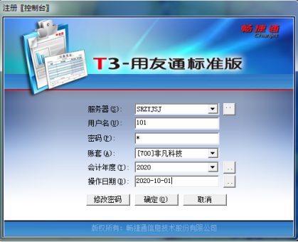 ①选择“开始”|“程序”|“T3企业管理信息化软件”|“T3”|“T3”,或者直接双击桌面“T3”图标,以101主管的身份进入系统,选择账套及操作日期,初始设置的操作日期以月初进入,如下图所示: