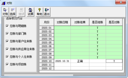 ②将光标定位在要进行对账的月份“2020.10”,单击“选择”按钮。