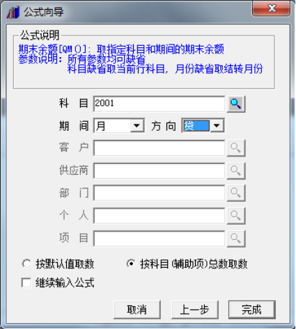 ⑧选择科目“2001”,单击“完成”按钮,返回金额公式栏。