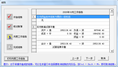 ⑤查看工作报告后,单击“下一步”按钮,单击“结账”按钮,若符合结账要求,