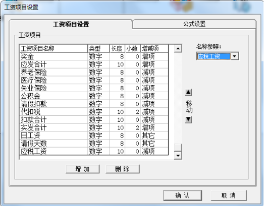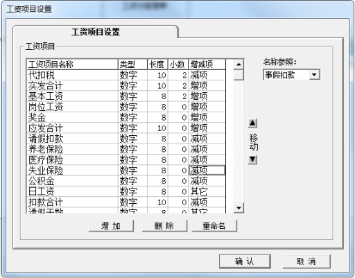 ③所有工资项目增加完成后,利用上移、下移按钮调整工资项目顺序,如下图所示: