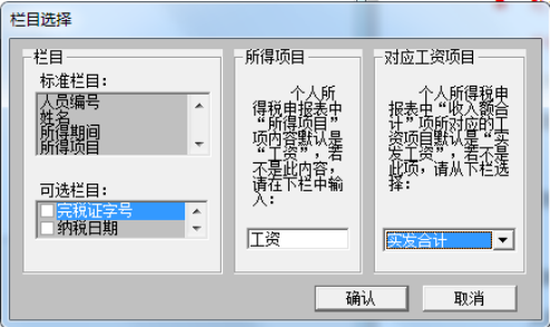 ①在“业务处理”|“扣缴所得税”命令,单击“确定”,打开“栏目选择”对话框。
