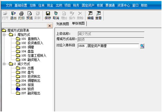 ④同理,输入减少方式为“损毁”的对应入账科目为“1606,固定资产清理”。